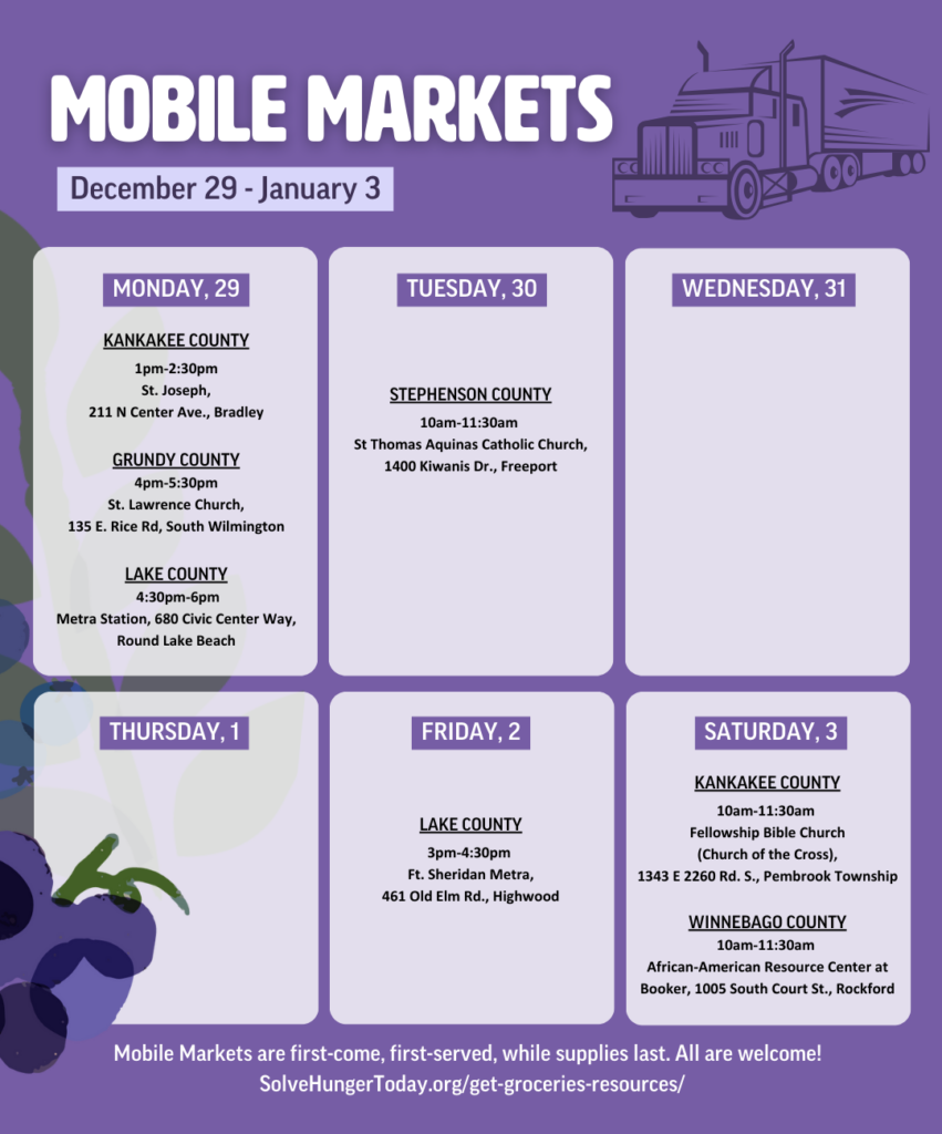 Each week our Mobile Markets are distributing free and fresh groceries to neighbors throughout Northern Illinois. Everyone is welcome. No ID, proof of income, or referral is needed. Check out the calendar below to see if there is a distribution coming to your community this week.