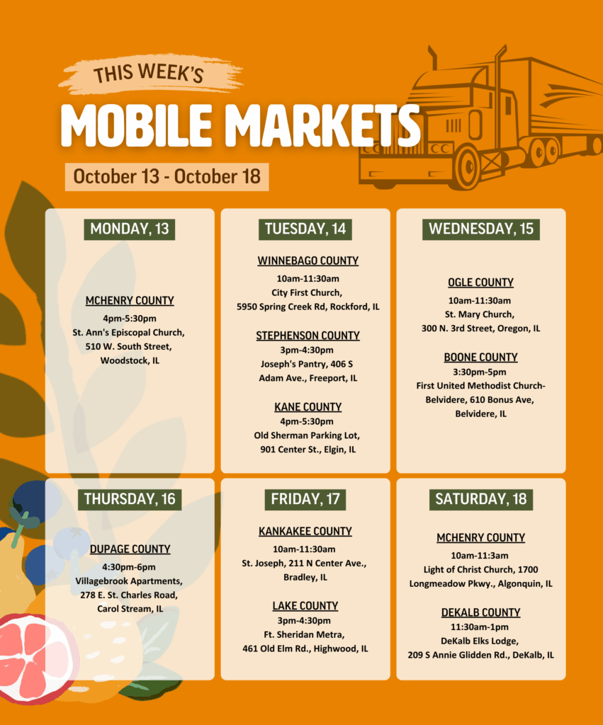 Each week our Mobile Markets are distributing free and fresh groceries to neighbors throughout Northern Illinois. Everyone is welcome. No ID, proof of income, or referral is needed. Check out the calendar below to see if there is a distribution coming to your community this week.